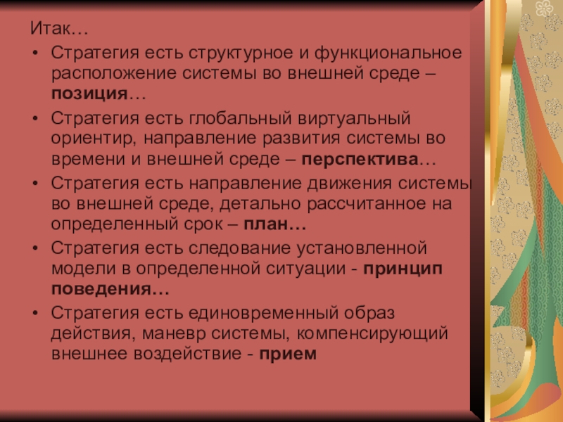 Стратегия есть направление движения системы во внешней среде, детально рассчитанное на определенный срок – план…