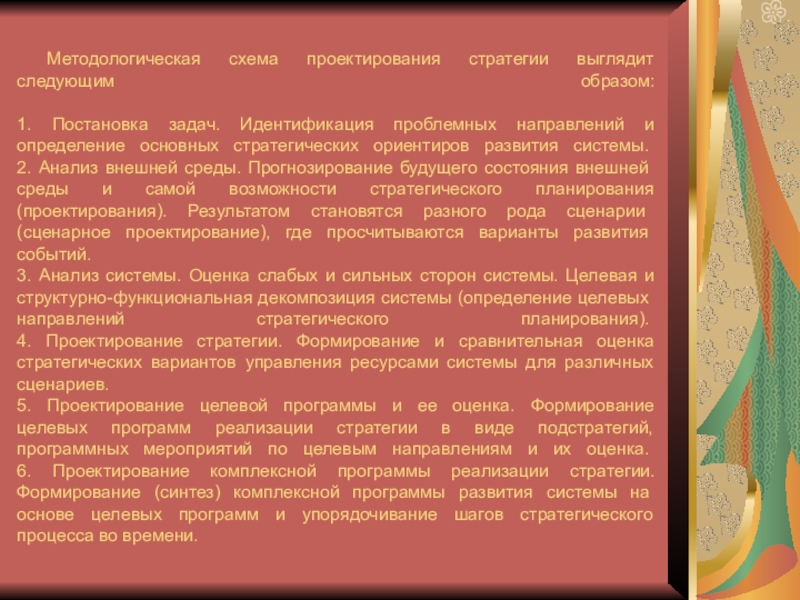 2. Анализ внешней среды. Прогнозирование будущего состояния внешней среды и самой возможности стратегического планирования (проектирования). Результатом становятся разного рода сценарии (сценарное проектирование), где просчитываются варианты развития событий.