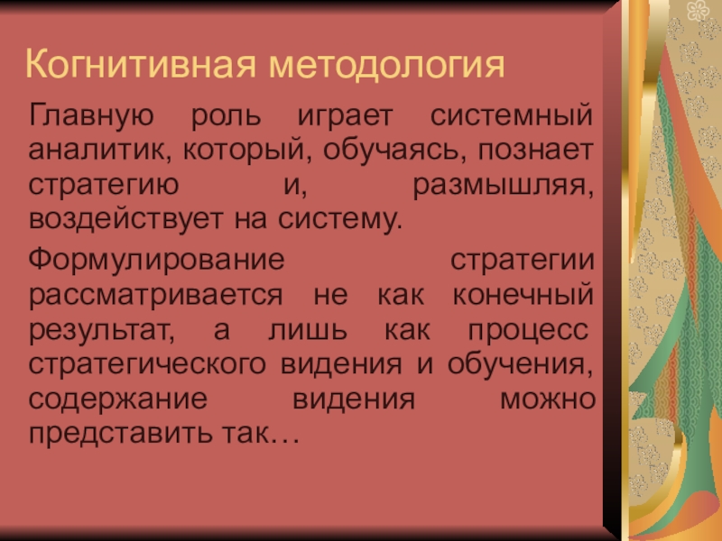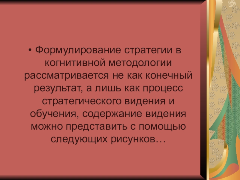 Слайд 23Формулирование стратегии в когнитивной методологии рассматривается не как конечный результат, а