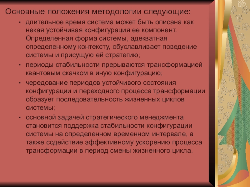 основной задачей стратегического менеджмента становится поддержка стабильности конфигурации системы на определенном временном интервале, а также содействие эффективному ускорению процесса трансформации в период смены жизненного цикла.