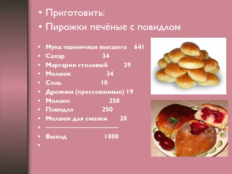 Приготовить:Пирожки печёные с повидломМука пшеничная высшего 641Сахар 34Маргарин столовый 29Меланж 34Соль
