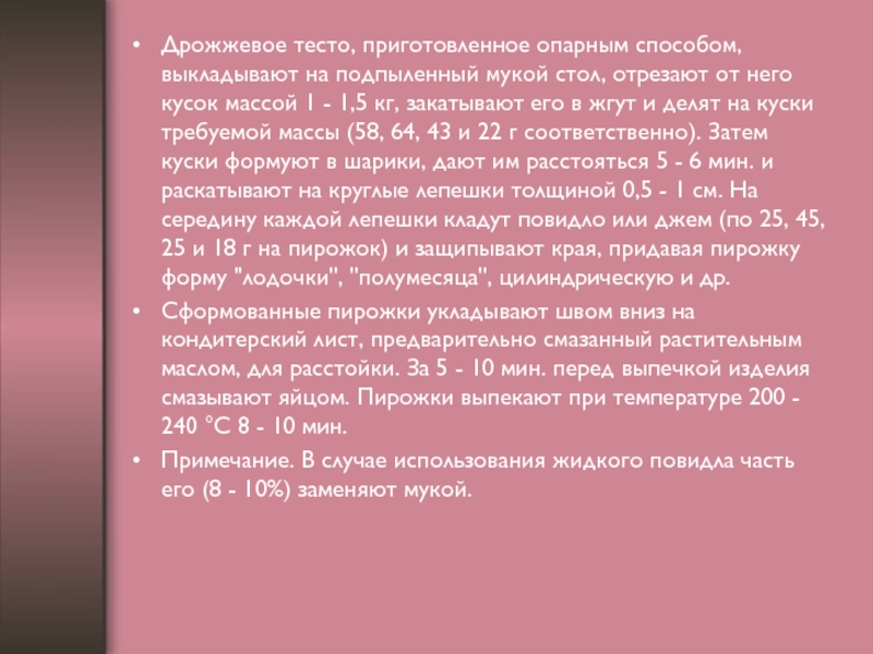 Слайд 3Дрожжевое тесто, приготовленное опарным способом, выкладывают на подпыленный мукой стол, отрезают