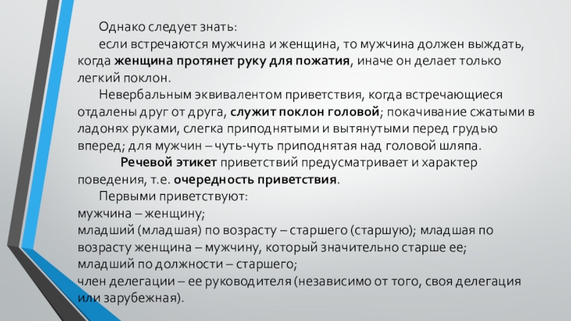 Речевой этикет приветствий предусматривает и характер поведения, т.е. очередность приветствия.