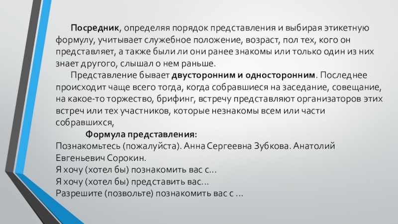 Слайд 8 Посредник, определяя порядок представления и выбирая этикетную формулу, учитывает служебное положение,