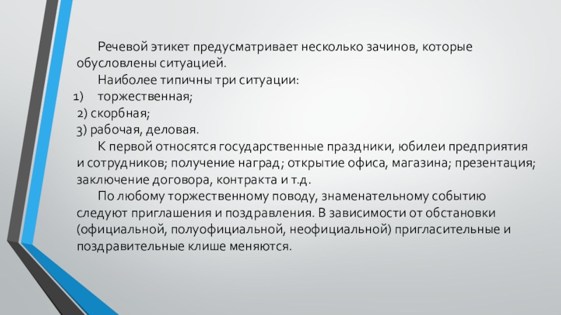 Слайд 12 Речевой этикет предусматривает несколько зачинов, которые обусловлены ситуацией.