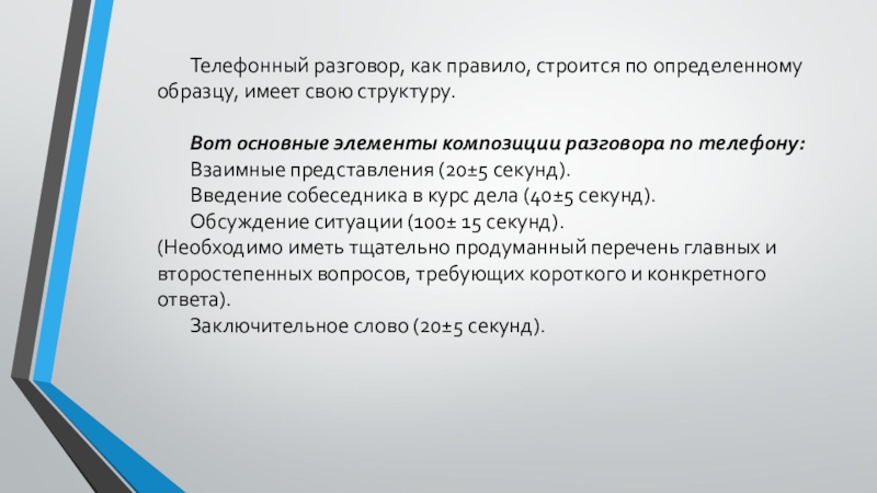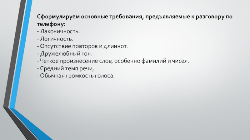 Слайд 18Сформулируем основные требования, предъявляемые к разговору по телефону: