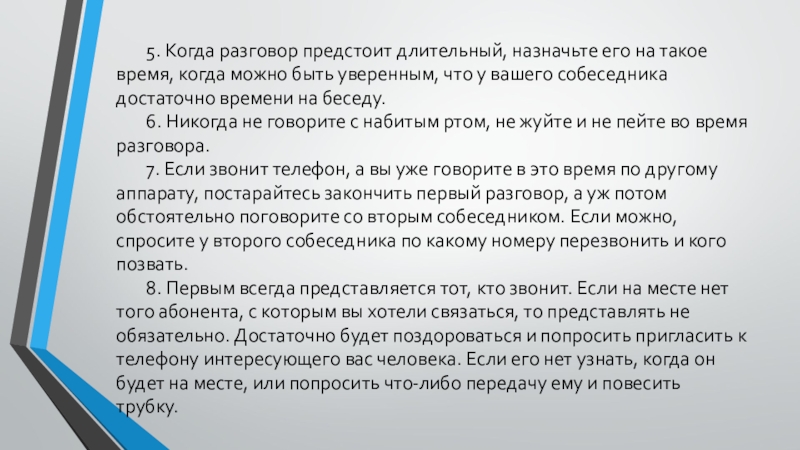 Слайд 15 5. Когда разговор предстоит длительный, назначьте его на такое время, когда