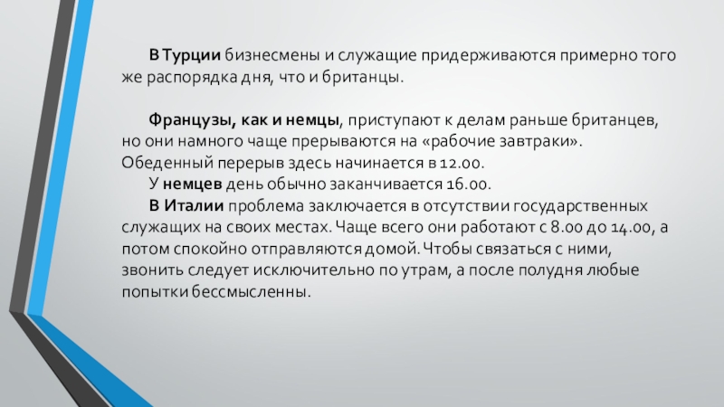 Слайд 20 В Турции бизнесмены и служащие придерживаются примерно того же распорядка дня,