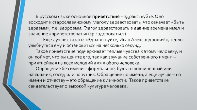 Слайд 10 В русском языке основное приветствие – здравствуйте. Оно восходит к старославянскому