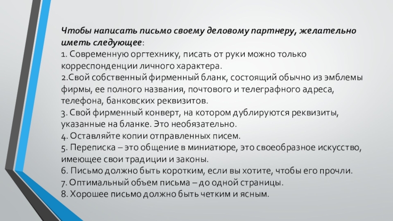 Слайд 23Чтобы написать письмо своему деловому партнеру, желательно иметь следующее: