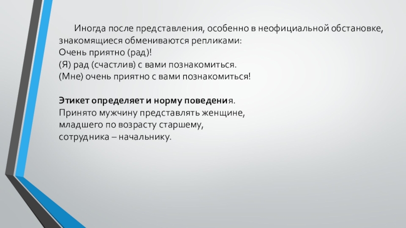 Слайд 9 Иногда после представления, особенно в неофициальной обстановке, знакомящиеся обмениваются репликами: