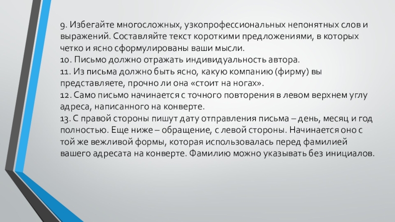 Слайд 249. Избегайте многосложных, узкопрофессиональных непонятных слов и выражений. Составляйте текст короткими