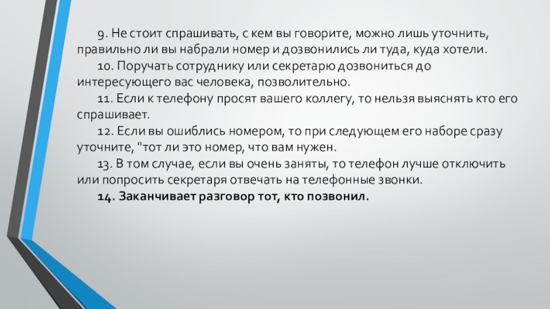 Слайд 16 9. Не стоит спрашивать, с кем вы говорите, можно лишь уточнить,