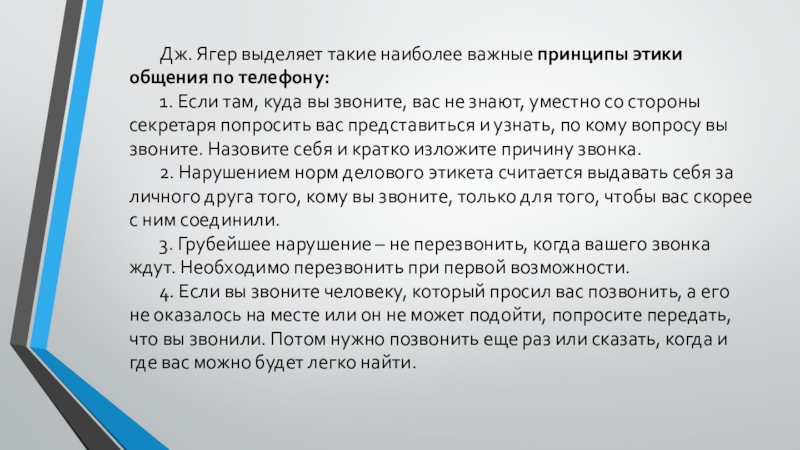 Слайд 14 Дж. Ягер выделяет такие наиболее важные принципы этики общения по телефону: