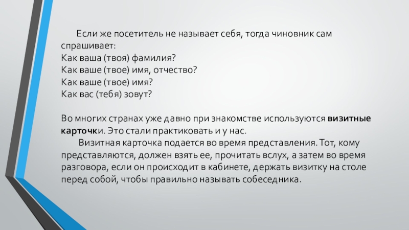 Слайд 7 Если же посетитель не называет себя, тогда чиновник сам спрашивает: