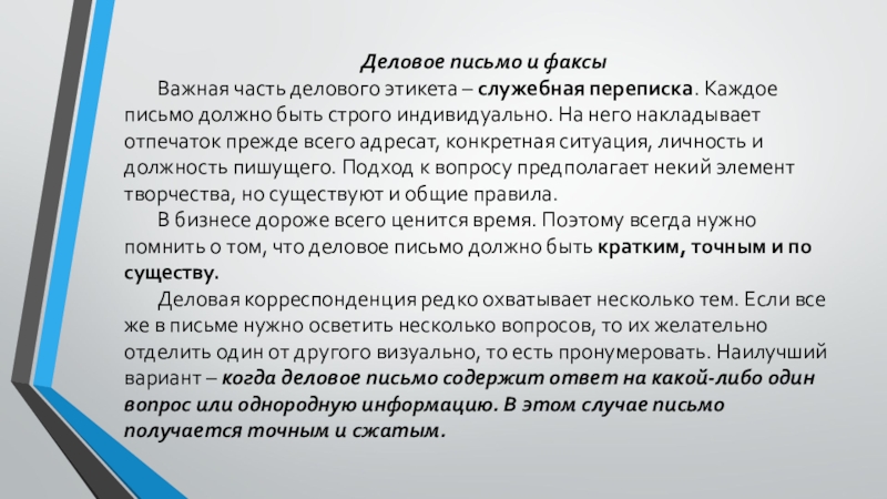 В бизнесе дороже всего ценится время. Поэтому всегда нужно помнить о том, что деловое письмо должно быть кратким, точным и по существу.