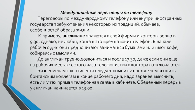 К примеру, англичане являются в свой фирмы и конторы ровно в 9.30, однако, не любят, когда в это время звонит телефон. В начале рабочего дня они предпочитают заниматься бумагами или пьют кофе, собираясь с мыслями.