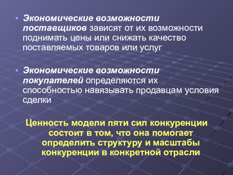 Слайд 17Экономические возможности поставщиков зависят от их возможности поднимать цены или снижать