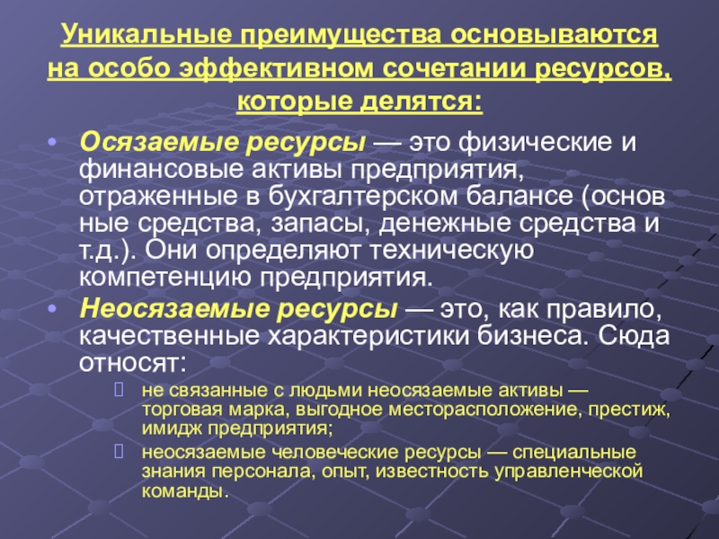 Слайд 24Уникальные преимущества основываются на особо эффективном сочетании ресурсов, которые делятся: