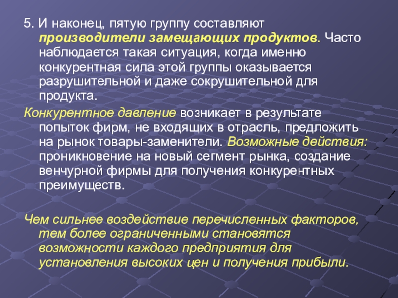 Слайд 145. И наконец, пятую группу составляют производители замещающих продуктов. Часто наблюдается