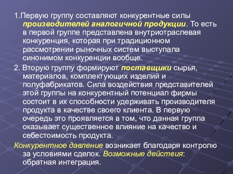 Слайд 121.Первую группу составляют конкурентные силы производителей аналогичной продукции. То есть в