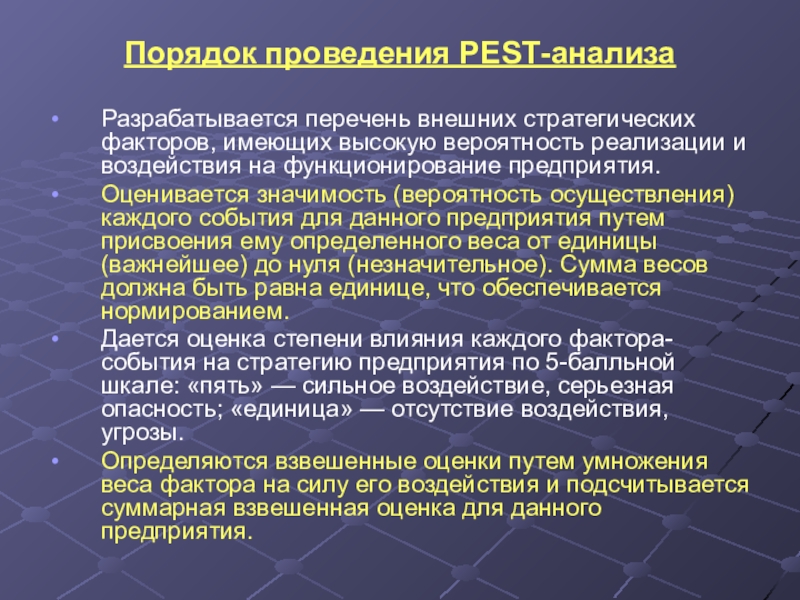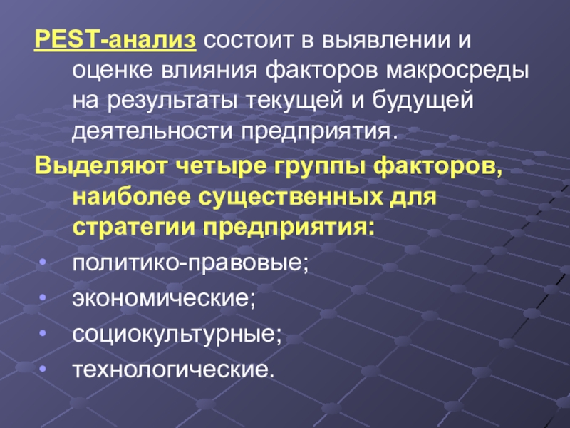 Слайд 5РЕSТ-анализ состоит в выявлении и оценке влияния факторов макросреды на результаты