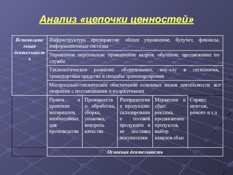 В «цепочке ценностей» деятельность предприятия подразделяется на два типа: