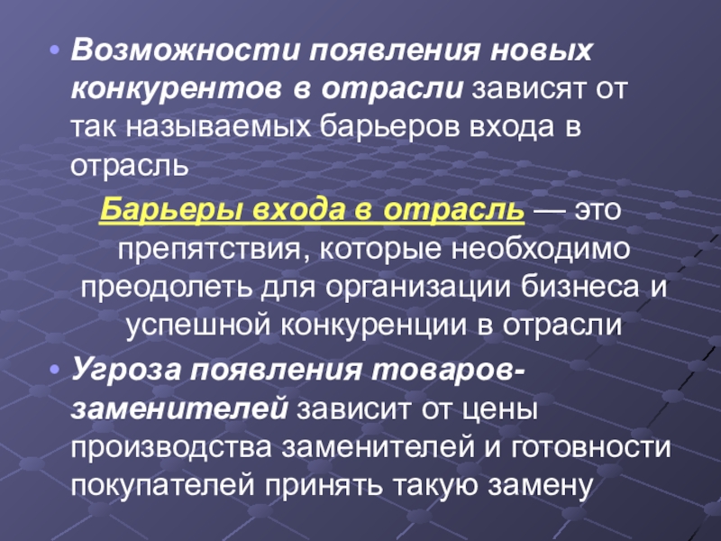 Слайд 16Возможности появления новых конкурентов в отрасли зависят от так называемых барьеров