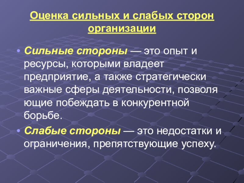ресурсы, которыми владеет предприятие, а также стратегически важные сферы деятельности, позволяющие побеждать в конкурентной борьбе.