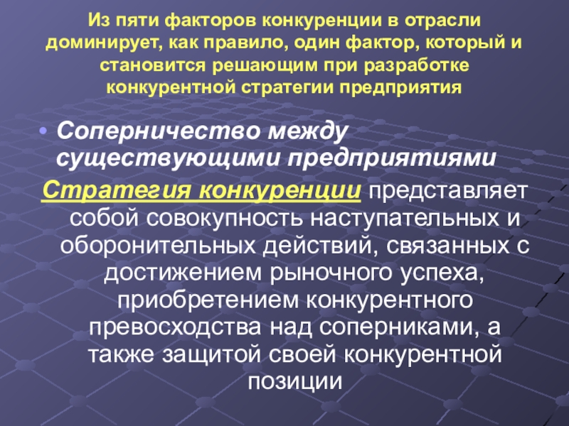 Слайд 15Из пяти факторов конкуренции в отрасли доминирует, как правило, один фактор,