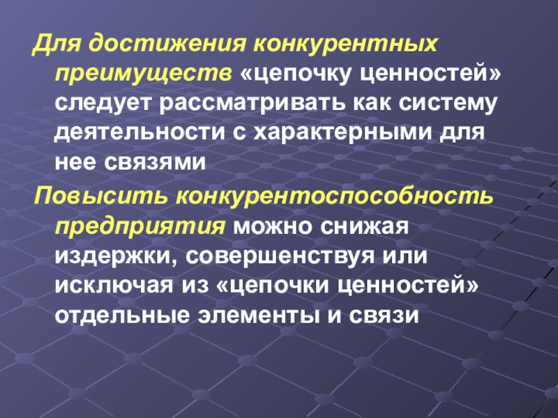 Слайд 28Для достижения конкурентных преимуществ «цепочку ценностей» следует рассматривать как систему деятельности