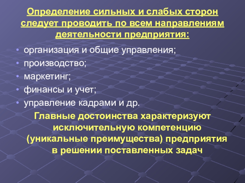 Слайд 23Определение сильных и слабых сторон следует проводить по всем направлениям деятельности
