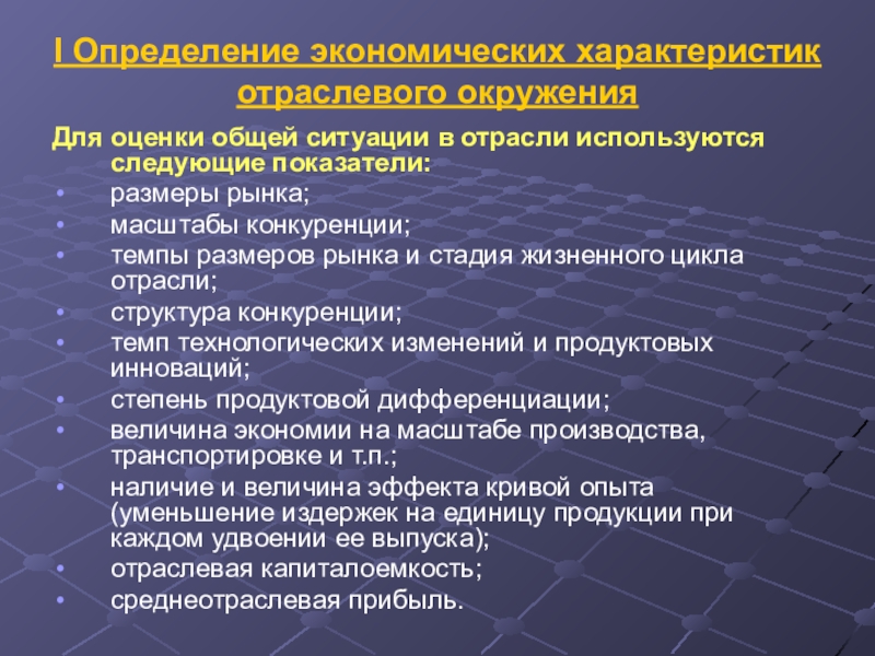Слайд 9I Определение экономических характеристик отраслевого окружения