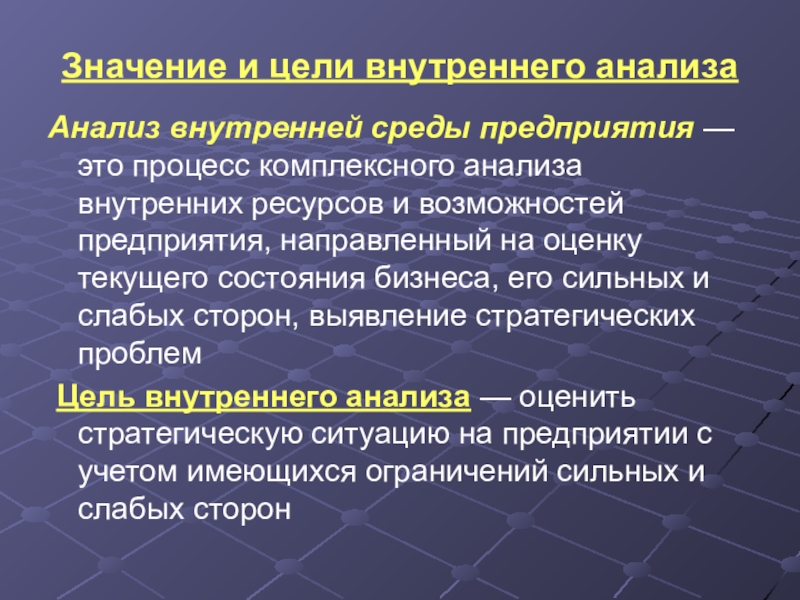 процесс комплексного анализа внутренних ресурсов и возможностей предприятия, направленный на оценку текущего состояния бизнеса, его сильных и слабых сторон, выявление стратегических проблем