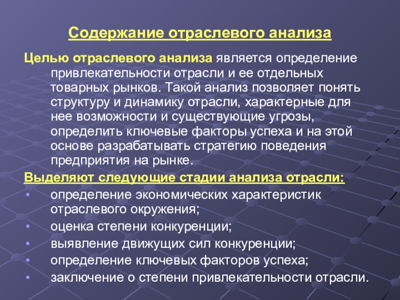 Целью отраслевого анализа является определение привлекательности отрасли и
