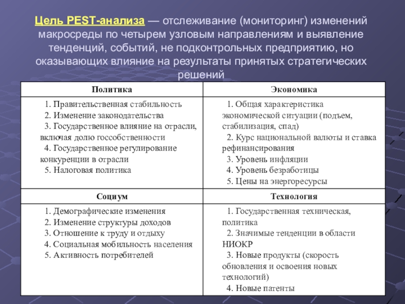 Слайд 6Цель РЕSТ-анализа — отслеживание (мониторинг) изменений макросреды по четырем узловым направлениям