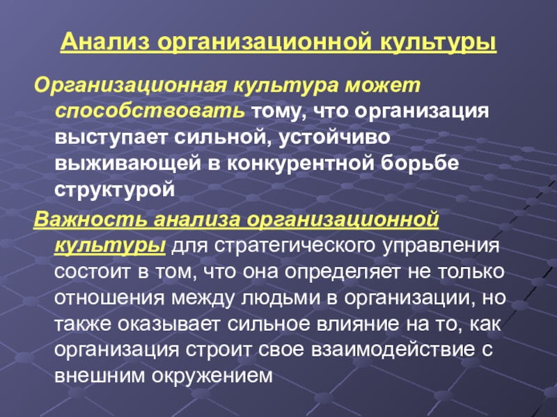 Важность анализа организационной культуры для стратегического управления состоит в том, что она определяет не только отношения между людьми в организации, но также оказывает сильное влияние на то, как организация строит свое взаимодействие с внешним окружением