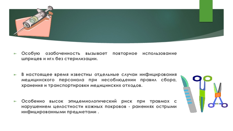 Слайд 4Особую озабоченность вызывает повторное использование шприцев и игл без стерилизации.