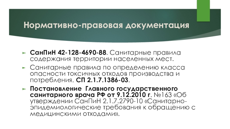 Постановление Главного государственного санитарного врача РФ от 9.12.2010 г. №163 «Об утверждении СанПиН 2.1.7.2790-10 «Санитарно-эпидемиологические требования к обращению с медицинскими отходами».