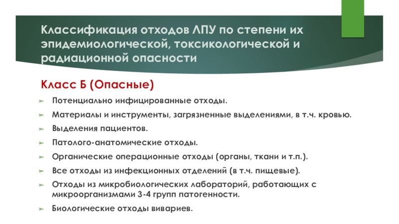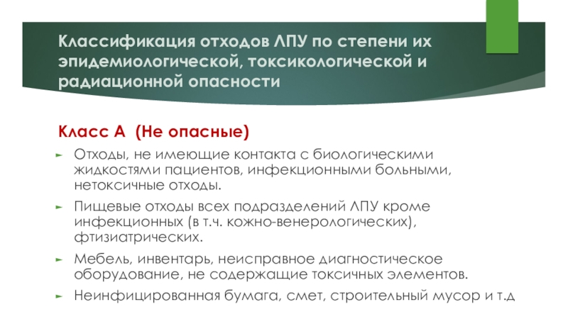 Слайд 18Классификация отходов ЛПУ по степени их эпидемиологической, токсикологической и радиационной опасности