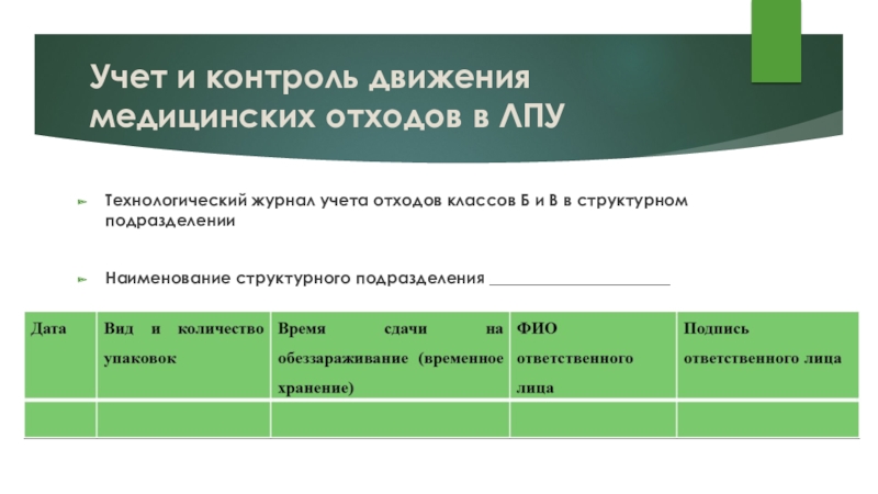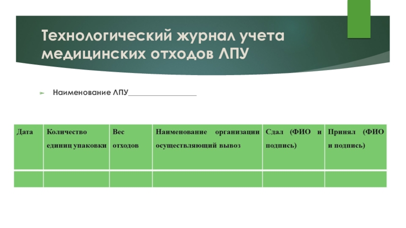 Слайд 32Технологический журнал учета медицинских отходов ЛПУ