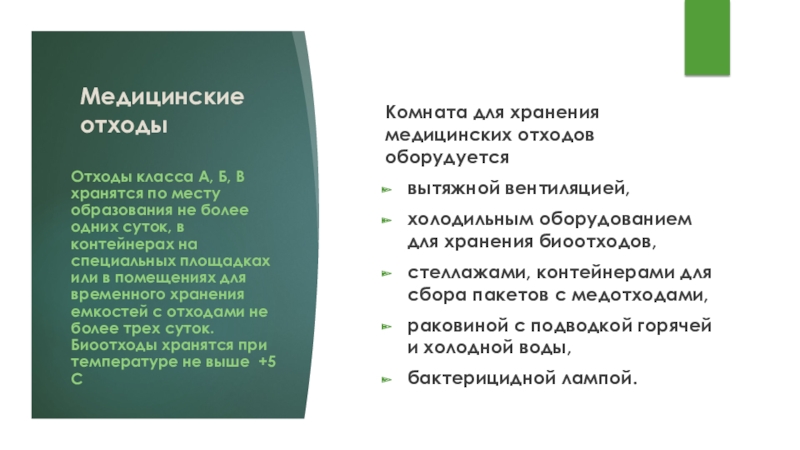 Отходы класса А, Б, В хранятся по месту образования не более одних суток, в контейнерах на специальных площадках или в помещениях для временного хранения емкостей с отходами не более трех суток. Биоотходы хранятся при температуре не выше +5 С