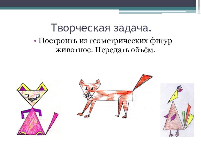 Творческая задача.Построить из геометрических фигур животное. Передать объём.