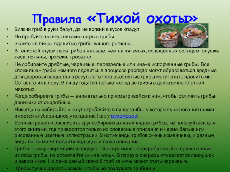 Не собирайте дряблые, червивые, перезрелые или иначе испорченные грибы. Все «пожилые» грибы немного ядовиты: в процессе распада могут образоваться вредные для здоровья вещества в результате чего съедобные грибы могут стать ядовитыми. Оставьте их в лесу. В пищу годятся только молодые грибы с достаточно плотной мякотью.
