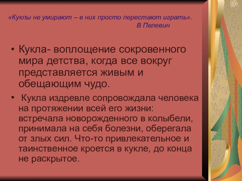 Кукла издревле сопровождала человека на протяжении всей его жизни: встречала новорожденного в колыбели, принимала на себя болезни, оберегала от злых сил. Что-то привлекательное и таинственное кроется в кукле, до конца не раскрытое.
