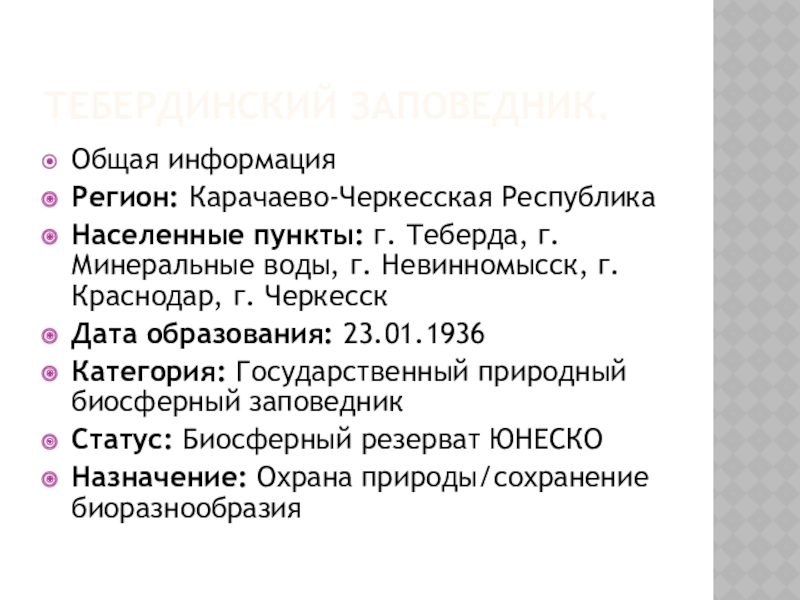 Тебердинский заповедник.Общая информацияРегион: Карачаево-Черкесская РеспубликаНаселенные пункты: г. Теберда, г. Минеральные воды, г. Невинномысск, г. Краснодар, г. ЧеркесскДата образования: 23.01.1936Категория: Государственный природный