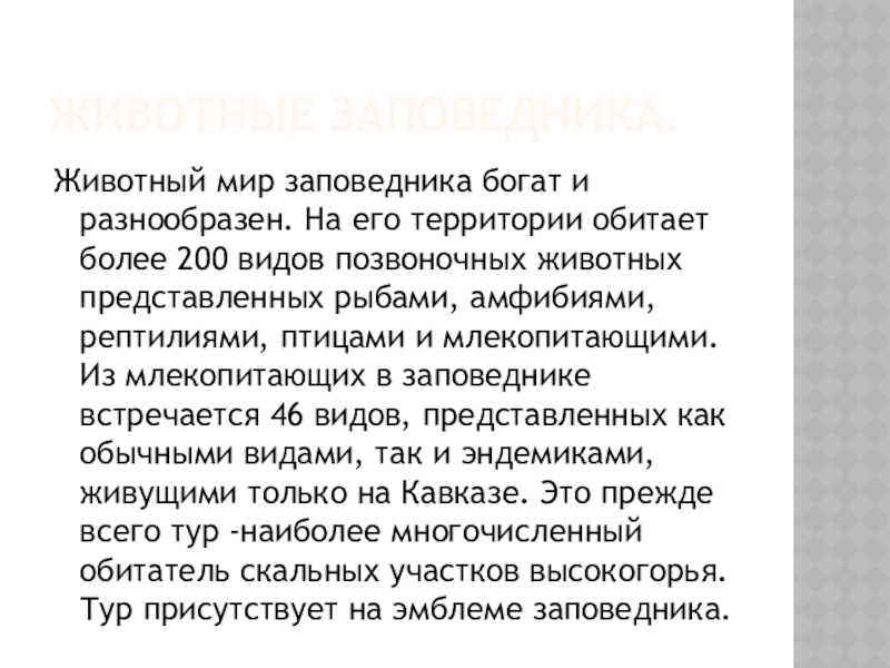 Животные заповедника.Животный мир заповедника богат и разнообразен. На его территории обитает более 200 видов позвоночных животных представленных
