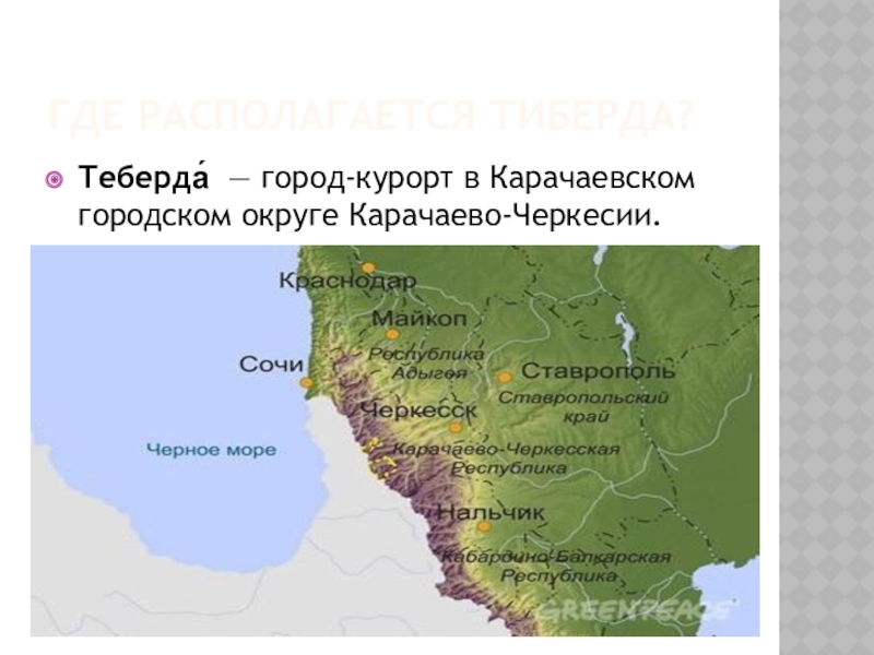 Где располагается тиберда?Теберда́  — город-курорт в Карачаевском городском округе Карачаево-Черкесии.