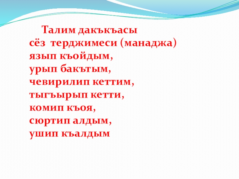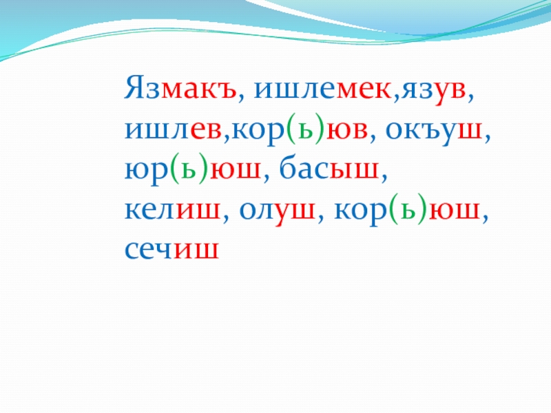 Слайд 7Язмакъ, ишлемек,язув, ишлев,кор(ь)юв, окъуш, юр(ь)юш, басыш, келиш, олуш, кор(ь)юш, сечиш