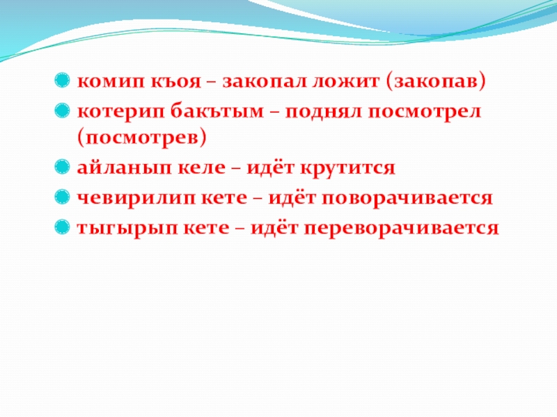 комип къоя – закопал ложит (закопав)котерип бакътым – поднял посмотрел (посмотрев)айланып келе – идёт крутитсячевирилип кете –